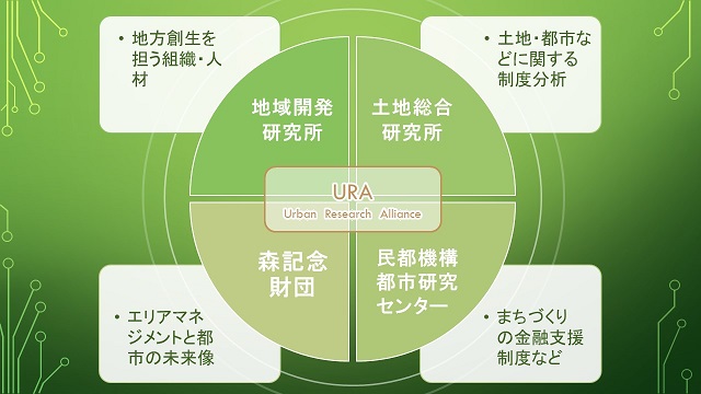一般財団法人土地総合研究所、一般財団法人民間都市開発推進機構、一般財団法人森記念財団、一般財団法人地域開発研究所の四研究機関が、それぞれの機関の研究能力、人材等を活かし連携・協力することによって、まちづくり、地域づくりの推進に資する研究・事業を展開し、我が国の国土・地域・都市の振興及びそれらを担う人材育成を図ることを目的として、2022年3月に発足しました。